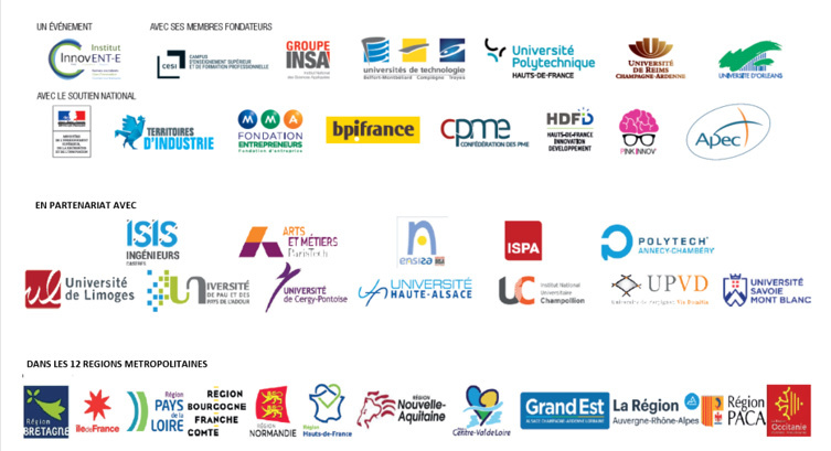 - le soutien au niveau national de la délégation interministérielle aux territoires d’industrie, de la BPI France, du Ministère de l’enseignement supérieur de la recherche et de l’innovation, de la CPME, de l’association Pink’Innov, de la fondation d'entreprise MMA des Entrepreneurs du Futur, de l’APEC et de plusieurs régions dont la plupart1 ont accompagné activement le projet InnovENT-E dès son lancement,